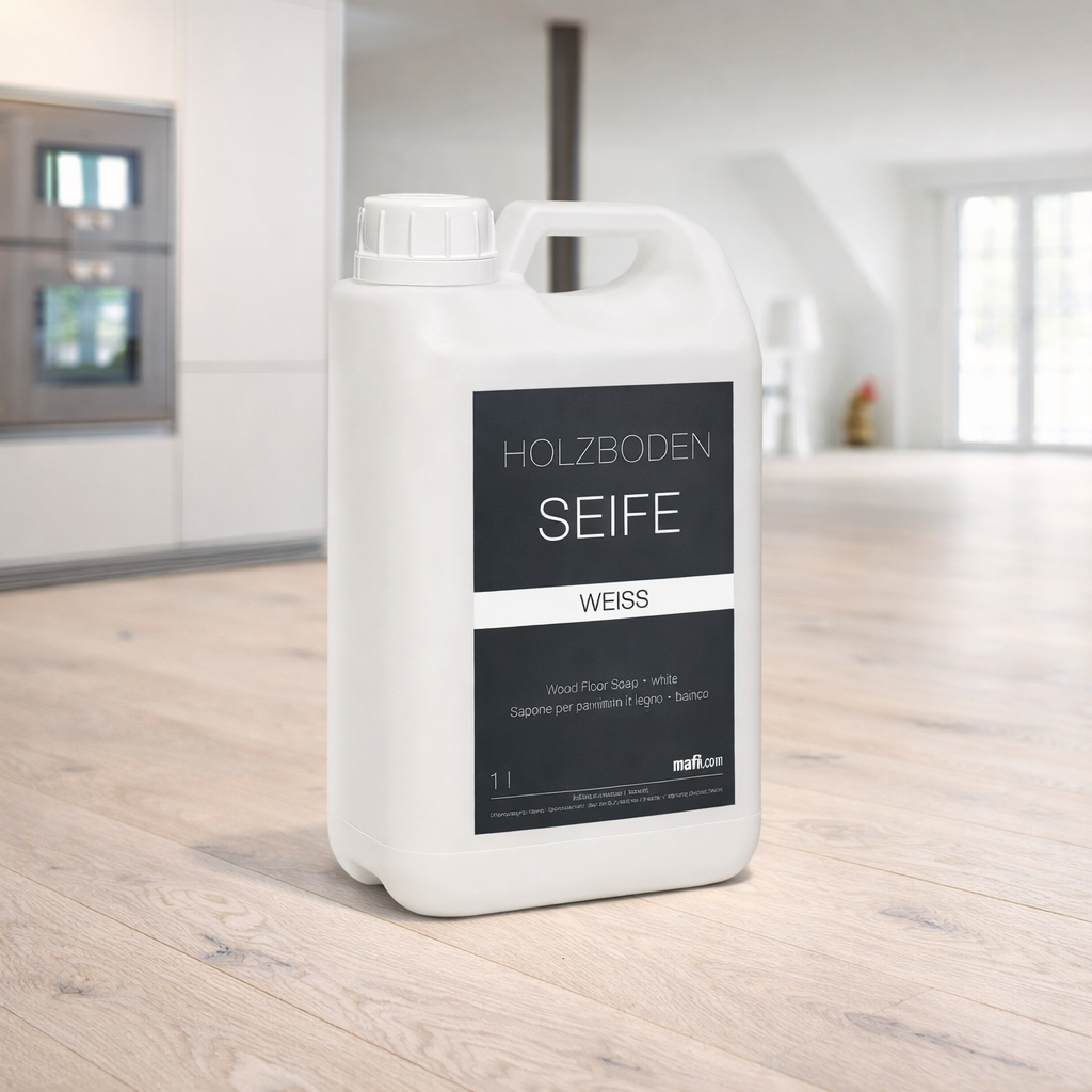 Speziell entwickelte Reinigung und Pflege für weiß geölte Parkett- und Holzböden. Die Seife reinigt den Boden schonend und frischt gleichzeitig den weißen Farbton der Oberfläche auf.